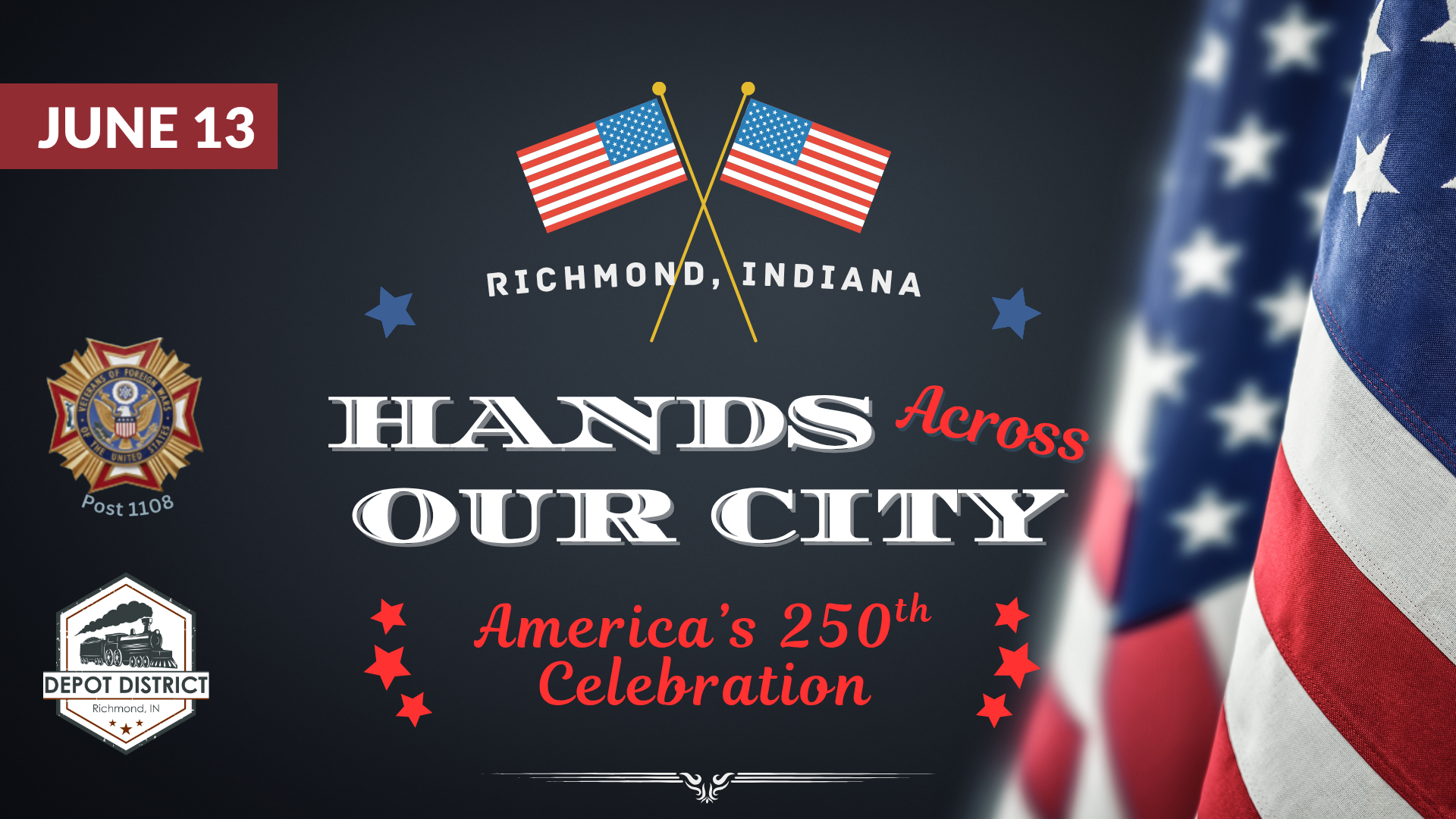 Richmond will come together in a powerful display of community spirit as we celebrate America’s 250th anniversary with Hands Across Our City on June 13, 2026. This special event invites residents, families, veterans, and visitors to line the downtown loop and take part in a symbolic commemorative flag passing around the city, beginning in the Depot District. The morning will feature a mayoral proclamation, the National Anthem, and a community-wide moment of connection as the flag travels through downtown Richmond.